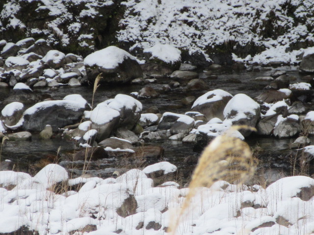 雪景色ですが晴れています、3.5度、20センチ減水濁り無し。 合掌 |